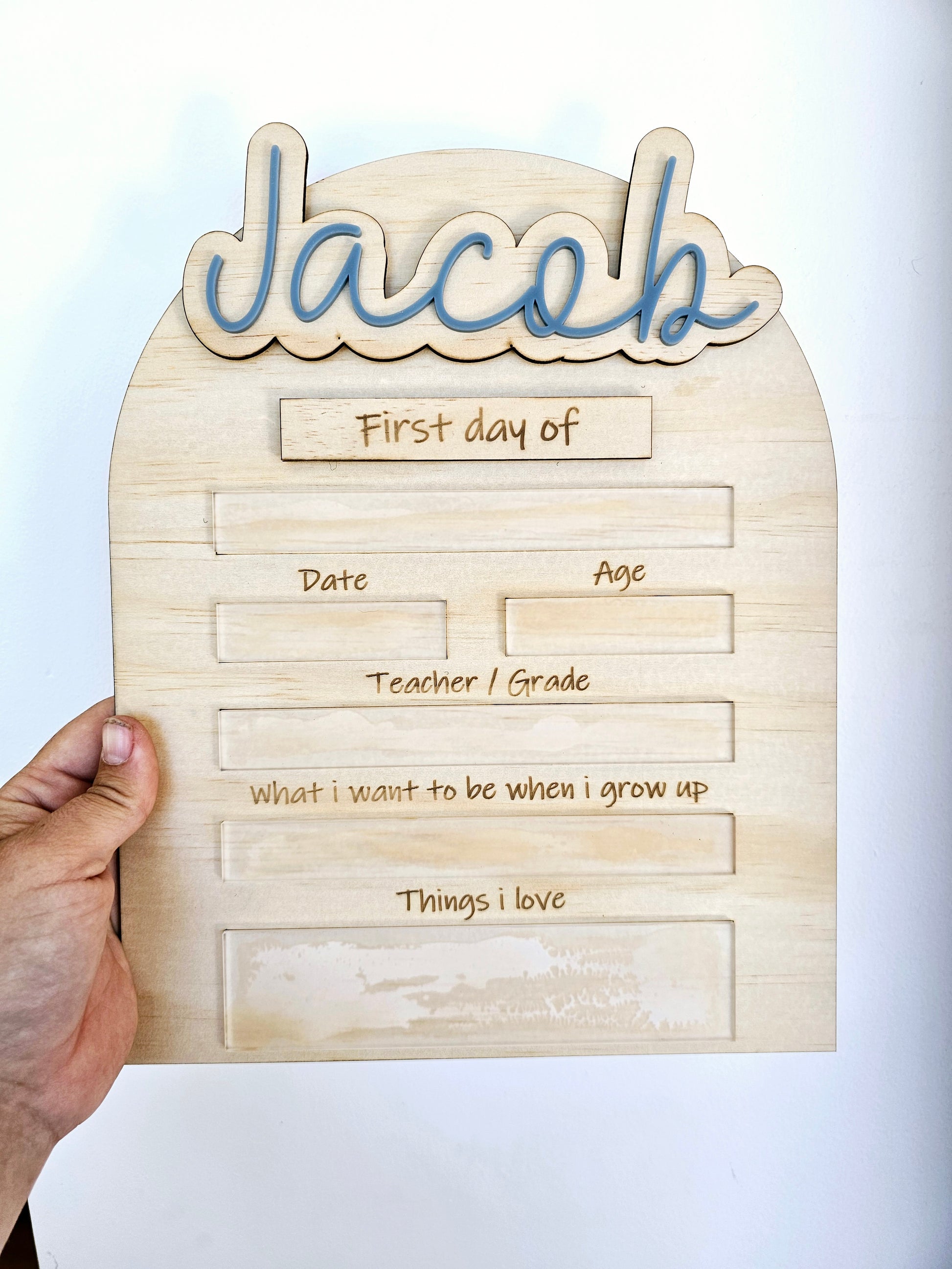 Introducing our new First/Last Day Boards, perfect for capturing and cherishing your child's milestones. Personalize with names and choose the color of the acrylic. One board for all your children, with interchangeable First Day and Last Day tags, and customizable with your children's names. Comes with 1 board, 1 First Day label, and 1 Last Day label. Order now and never miss a special moment again.