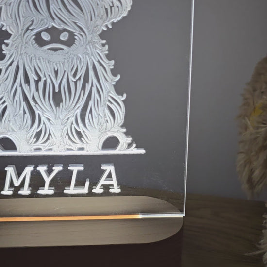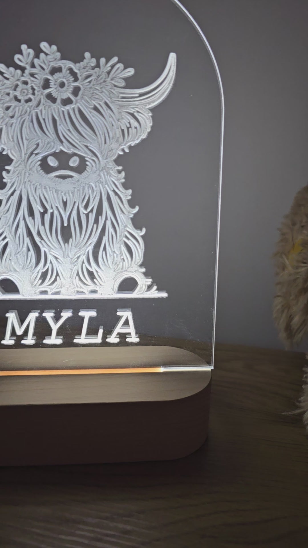 Illuminate your child's room with a touch of nature with our Highland Cow LED Light. Featuring 3 adjustable light settings, this light can be personalized with your child's name. Brighten up or dim down the light to fit any mood or occasion. Add a unique and beautiful touch to your child's space.