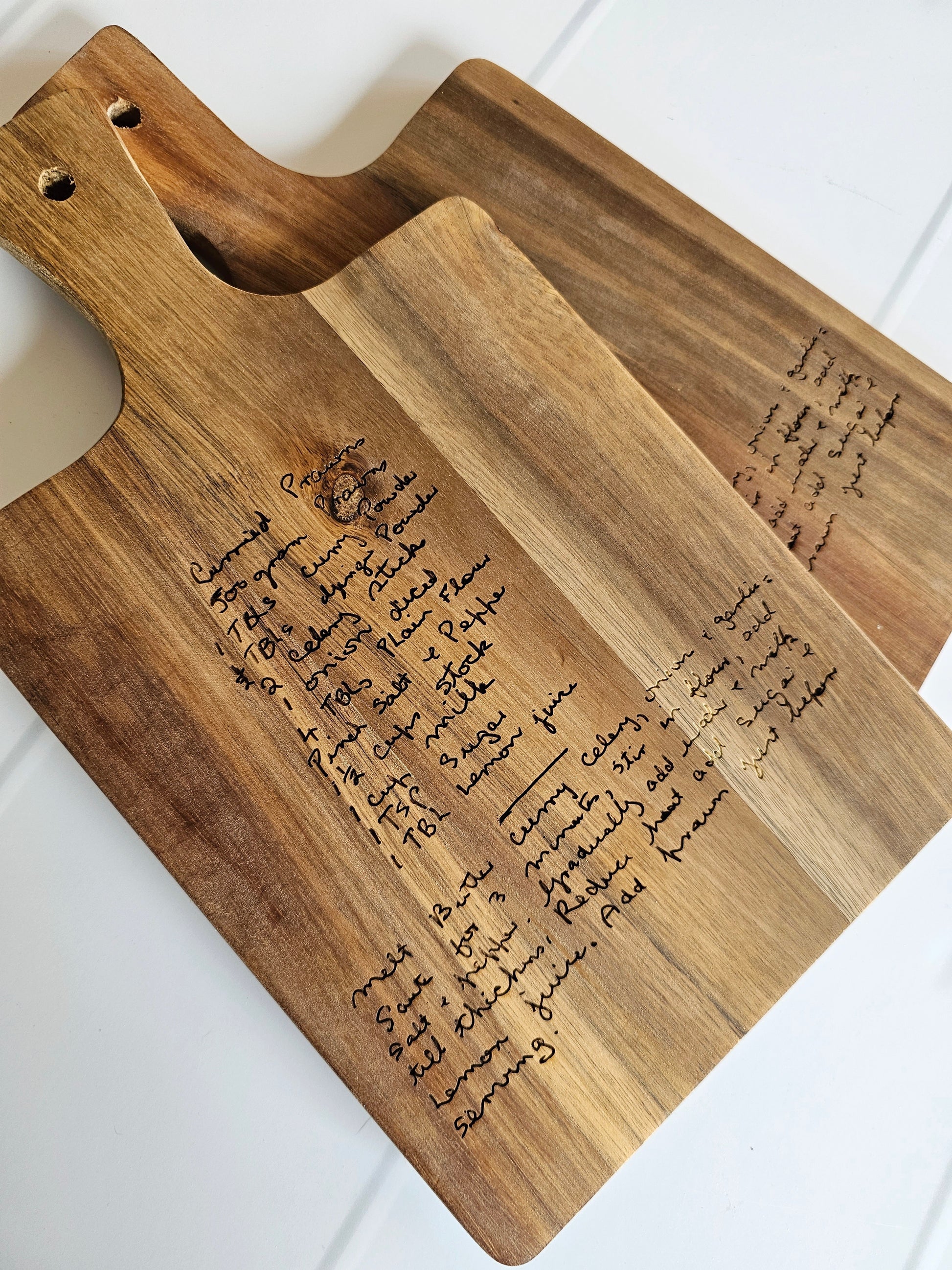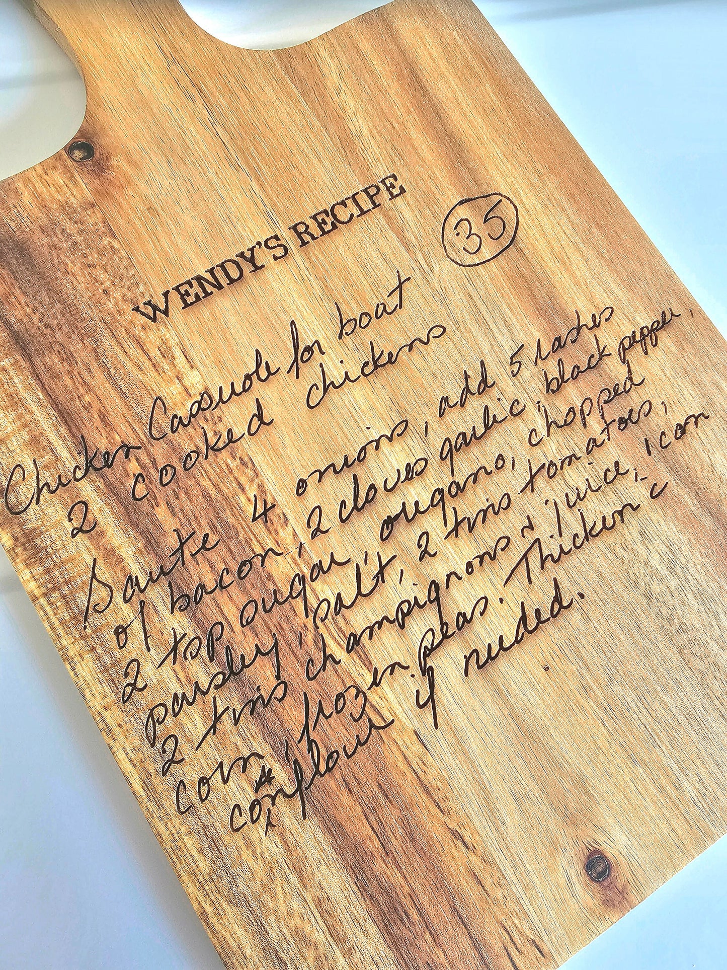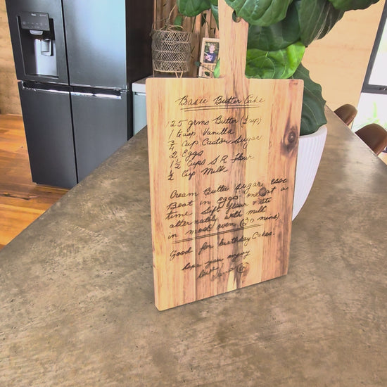 Transform cherished handwritten recipes into a beautiful keepsake with Recipe Boards. Preserve the memory of your loved one by using their handwriting to create a one-of-a-kind piece. Each board is crafted with care, making it a perfect gift for any occasion. Capture a special moment in time with our Recipe Boards.