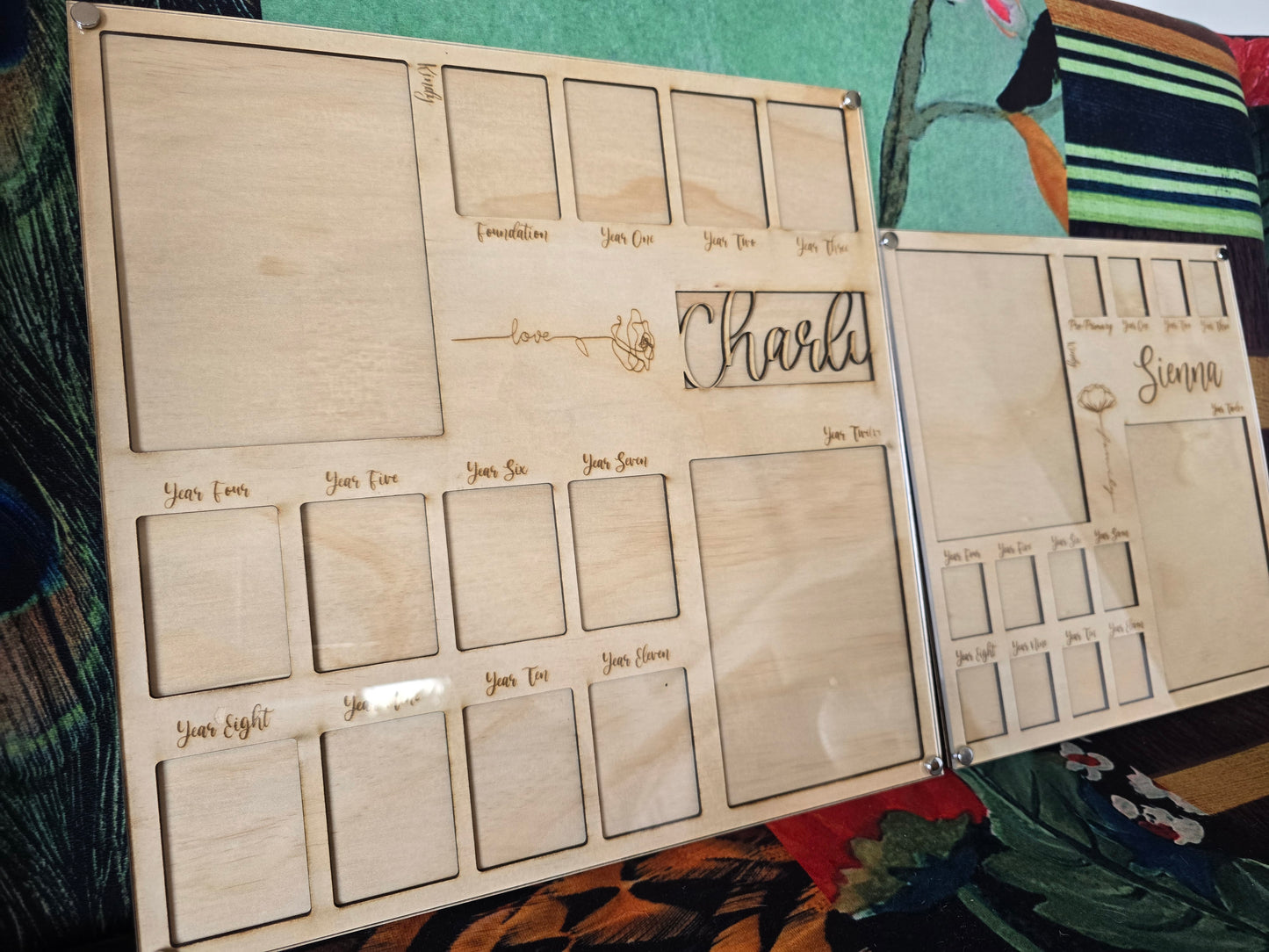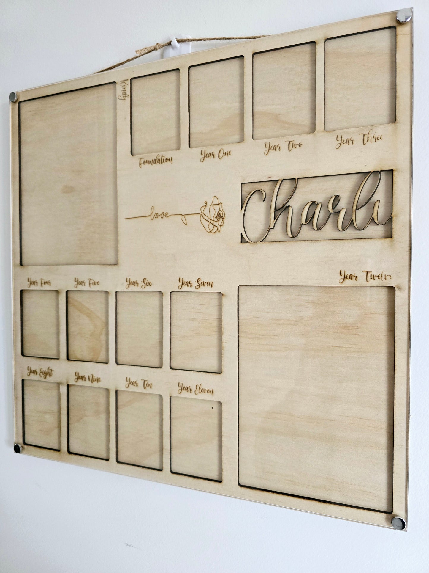Preserve your child's school memories with our Personalized School Photo Frame Kindy - Year 12. Made of durable clear acrylic and timber ply, this frame can be etched or laser cut with your loved one's name. Measuring 380mm x 380mm, it 2 large (5x7 inch) and 12 small (5cm x 7cm) photos. Hang it with the included twine rope and choose from different personalization options for varying state school levels.